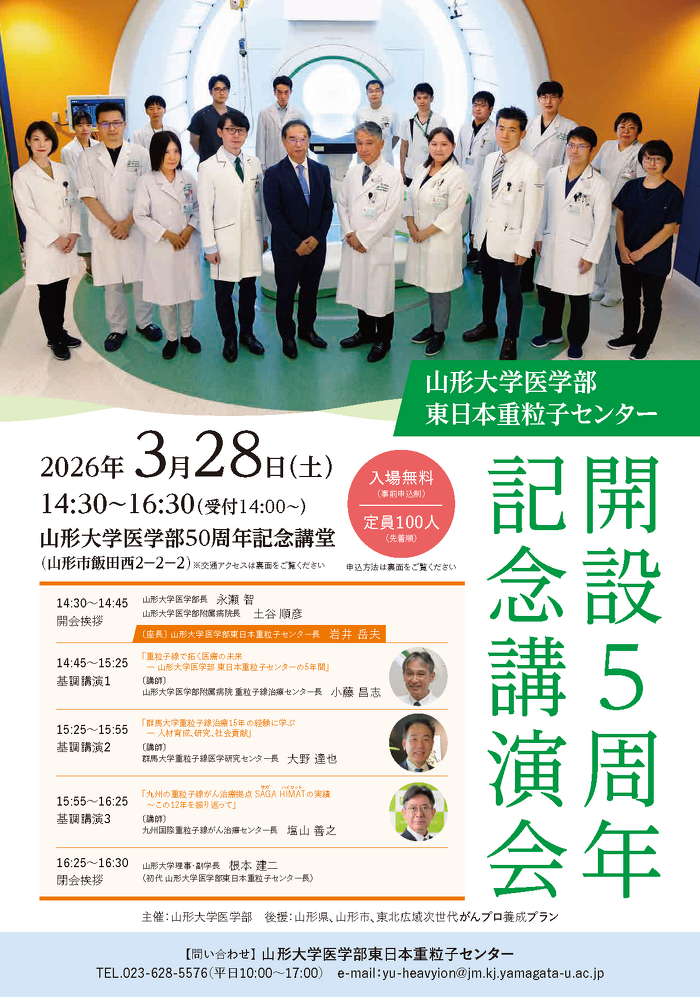 山形大学医学部東日本重粒子センターは、2026年2月に治療開始5周年を迎えます。これを記念し、山形大学に先駆けて重粒子線治療を推進されてきた群馬大学重粒子線医学研究センターから大野達也先生、九州国際重粒子線がん治療センターから塩山善之先生をお招きして開設5周年記念講演会を開催いたします。ご興味があればぜひお申し込みください。