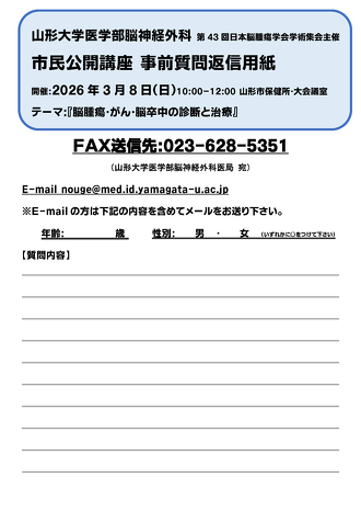 3月8日(日) 10:00~山形市保健所を会場に開催される日本脳腫瘍学会学術集会主催の市民公開講座で重粒子線治療センター長の小藤昌志教授が「がんに対する重粒子線治療」をテーマに講演いたします。